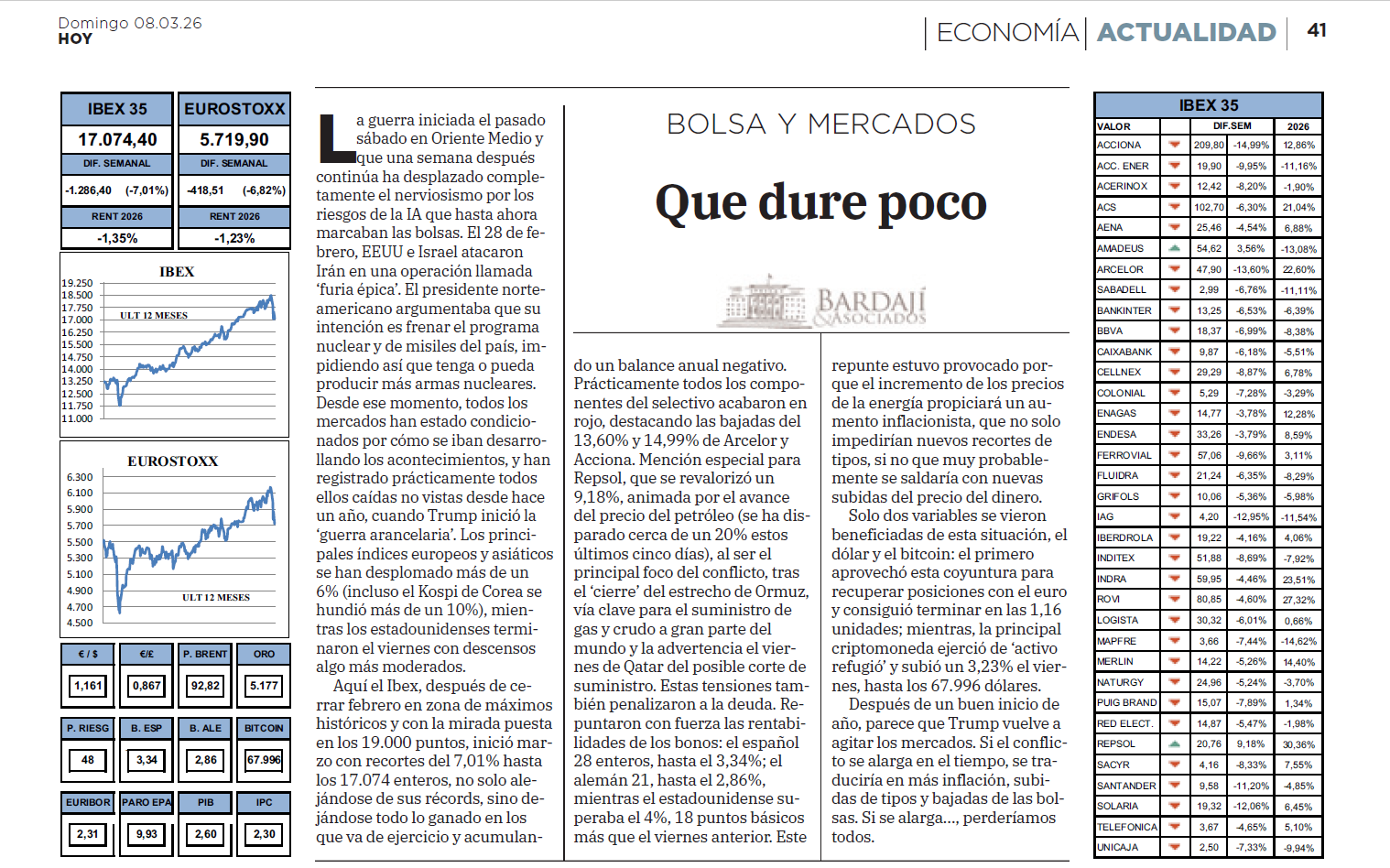 Crónicas publicadas por Bardají & Asociados en el Diario HoyINCERTIDUMBRE MÁXIMA 15 de marzo de 2026 QUE DURE POCO 8 de marzo de 2026 EL IBEX CONTINUA IMPARABLE 1 de marzo de 2026EL IBEX SE ACERCA A MÁXIMOS 22 de febrero de 2026EL IBEX SE ALEJA DE LOS 18.000 PUNTOS 15 de febrero de 2026 Compartir